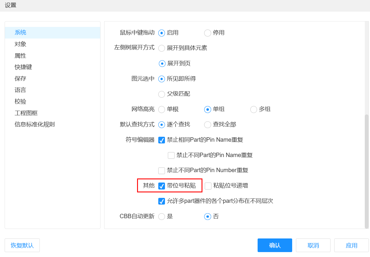 在原理图编辑器->设置->系统,勾选带位号粘贴,然后再复制CBB到新工程即可