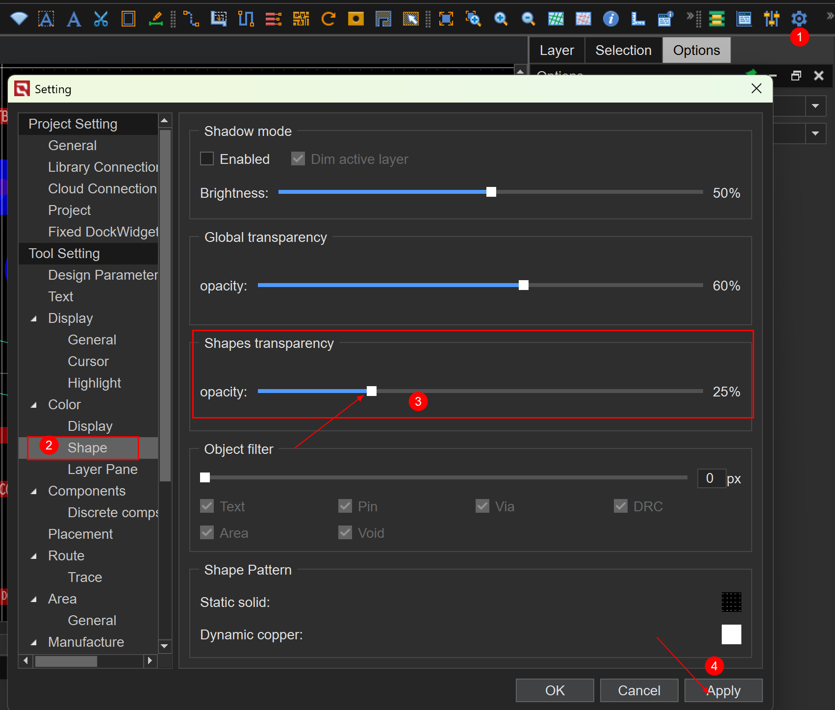 1、可以通过设置铜皮的透明度来达到隐藏铜皮的目的:操作路径:setting-color-shape-shape transparency