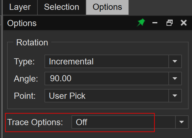 【板级EDA】【一般】【Move】移动命令执行时的飞线显示开关 日期: 2026-03-13 分类: 分享与推广 问题描述 告警信息 处理过程 根因 解决方案 建议与总结 │问题描述 移动命令执行时的飞线显示开关 │解决方案 点击Move,在Options下的Trace Options选择off