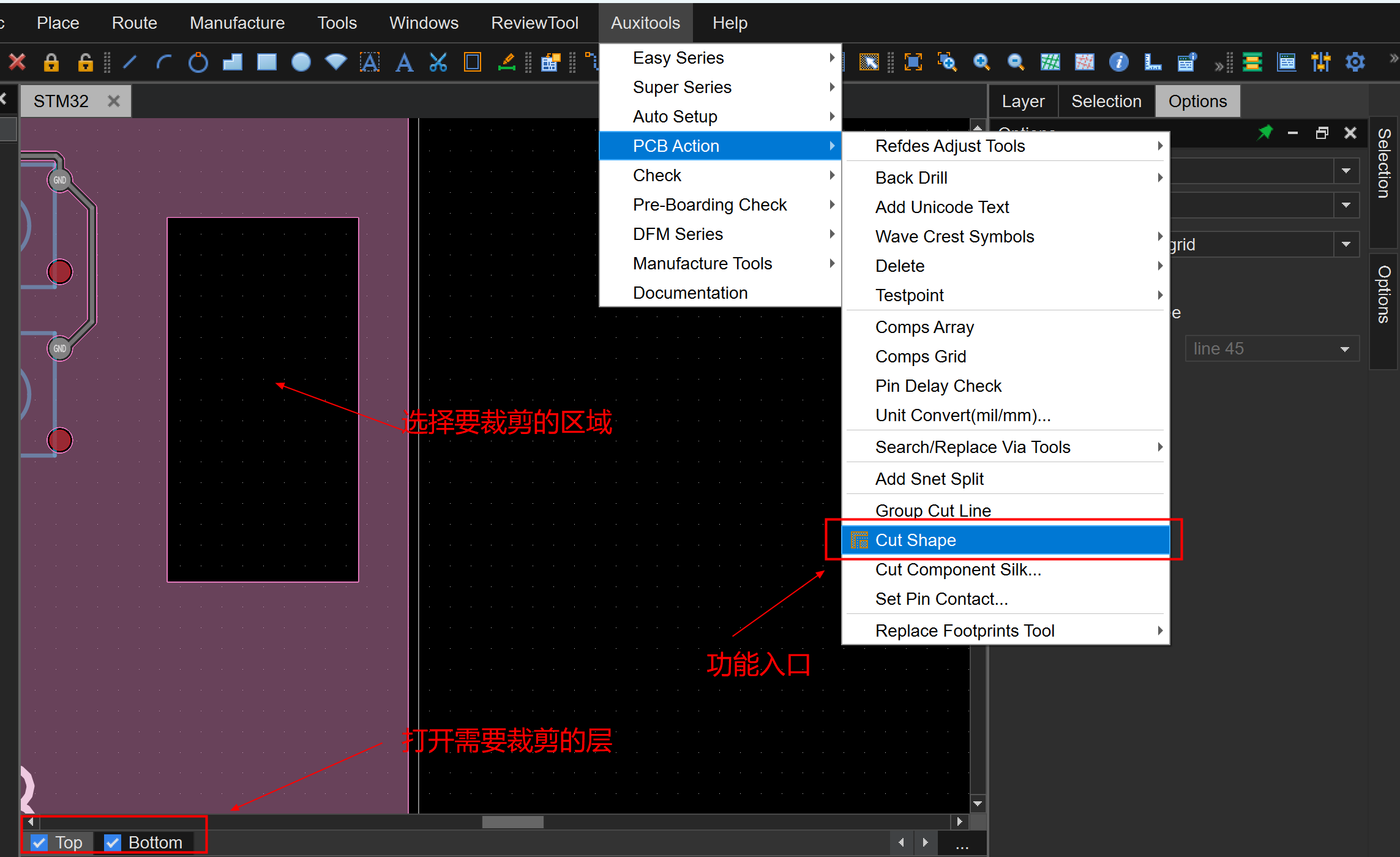 功能入口:Auxitools-->PCB Action-->Cut Shape