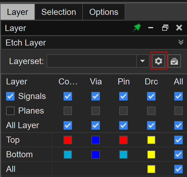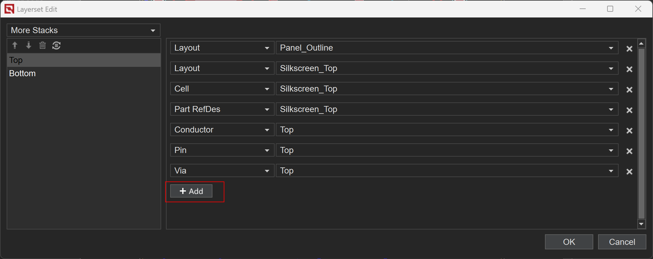 【板级EDA】【一般】【layer】layer层可以手动添加其他层选项吗? 日期: 2026-03-04 分类: 解决方案类 问题描述 告警信息 处理过程 根因 解决方案 建议与总结 │问题描述 layer层可以手动添加其他层选项吗? │解决方案 点击Layerset右边的设置按钮在弹出的窗口自行添加