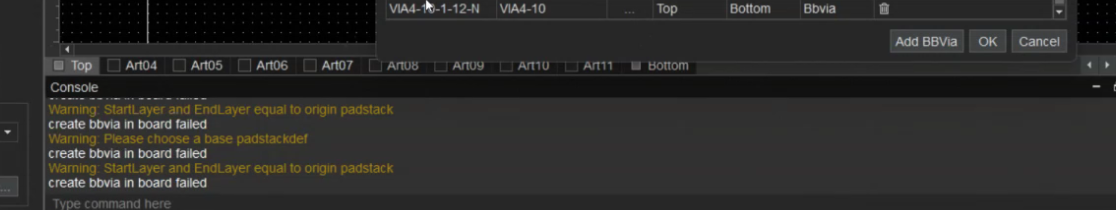 【板级EDA】【PCB设计】B/B via definition工具报错提示:create bbvia in board failed Warning: StartLayer and EndLayer equal to origin如何处理?