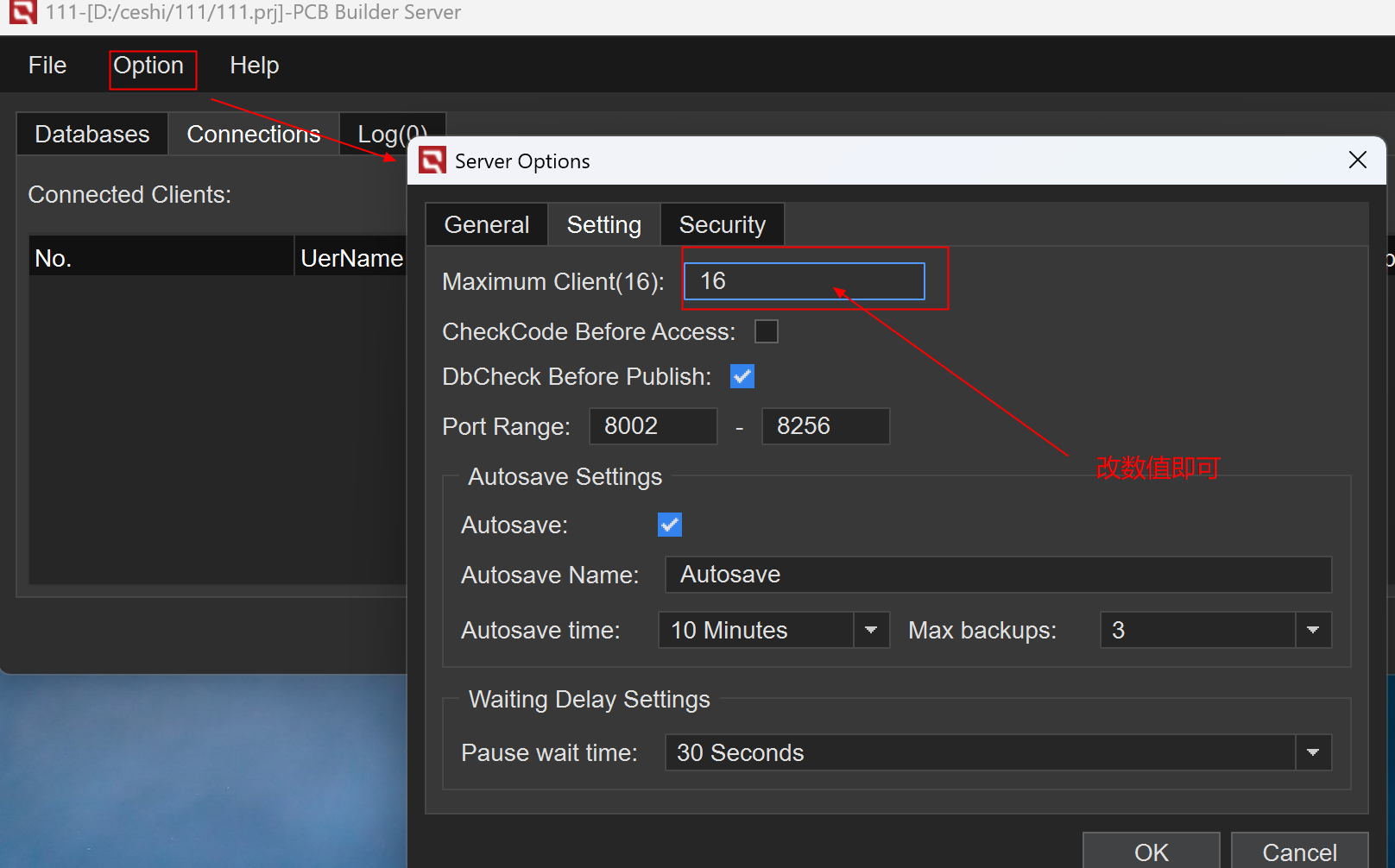 【板级EDA】【PCB设计】如何设置最大协同人数 日期: 2026-03-04 分类: 解决方案类 问题描述 告警信息 处理过程 根因 解决方案 建议与总结 │问题描述 如何设置最大协同人数 │解决方案 server算开启后,在option面板上设置,如图所示