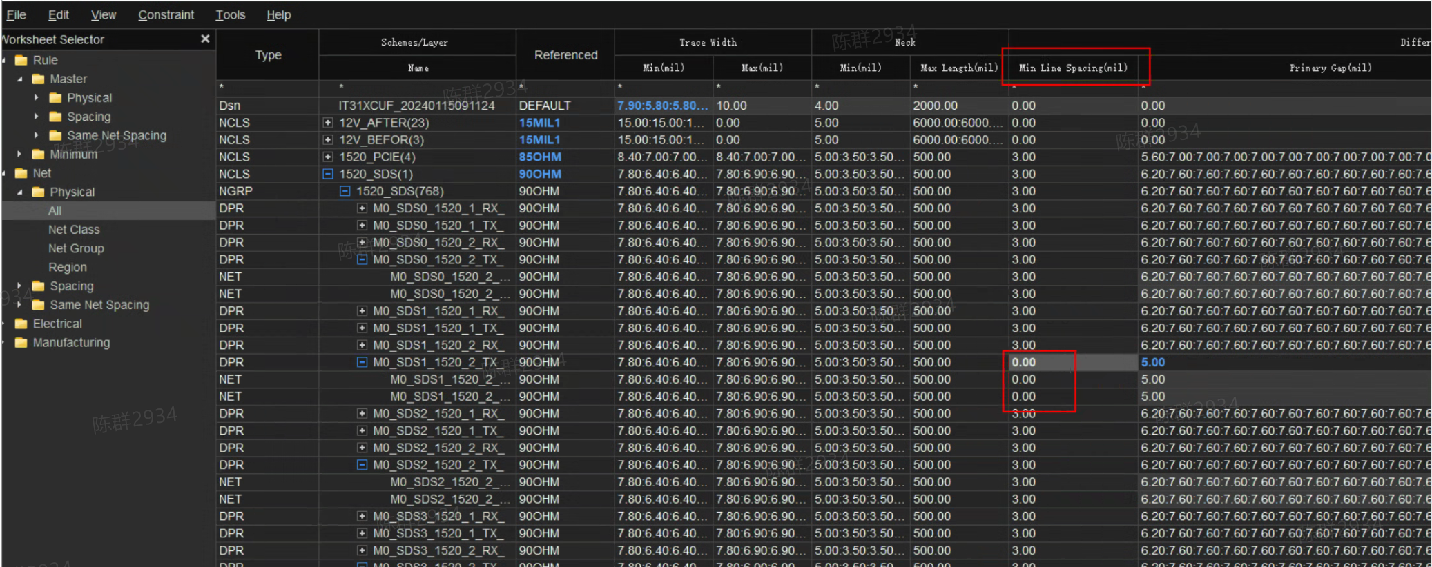 规则管理器中physical栏differential pair的min line spacing值不能为0,如为0,将检查对应spacing规则的trace to trace