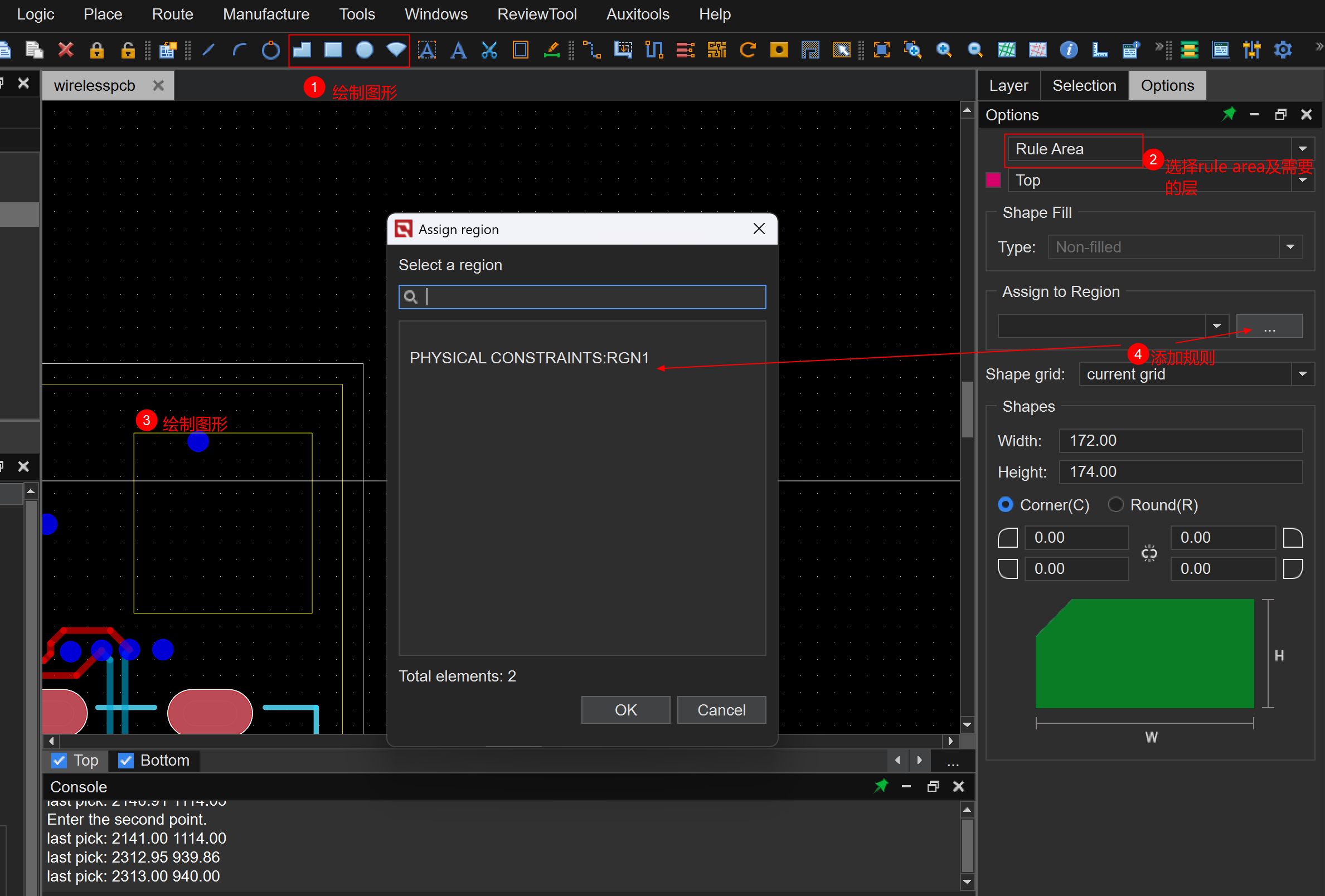 注意:PCB中给region区域赋规则与A有所不同:A中仅支持同时给区域添加物理、间距规则;PCB软件中支持分别添加规则。