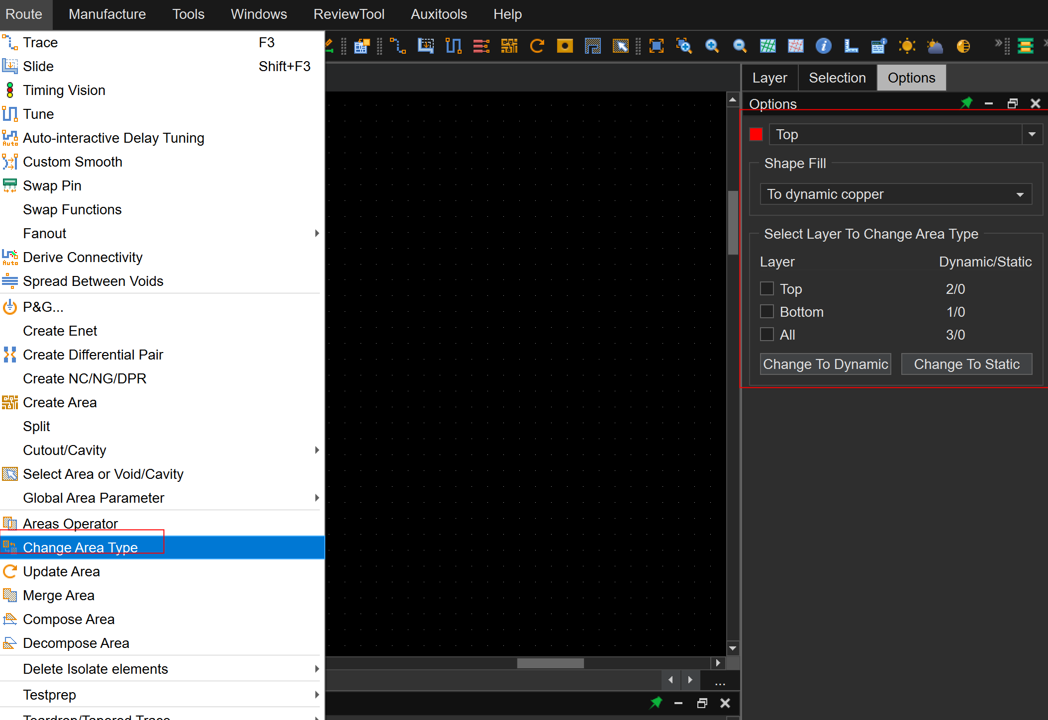 Options选择对应的层,再选择静态铜皮static solid,画板中点击要更改的铜皮;或者点击Change To Static