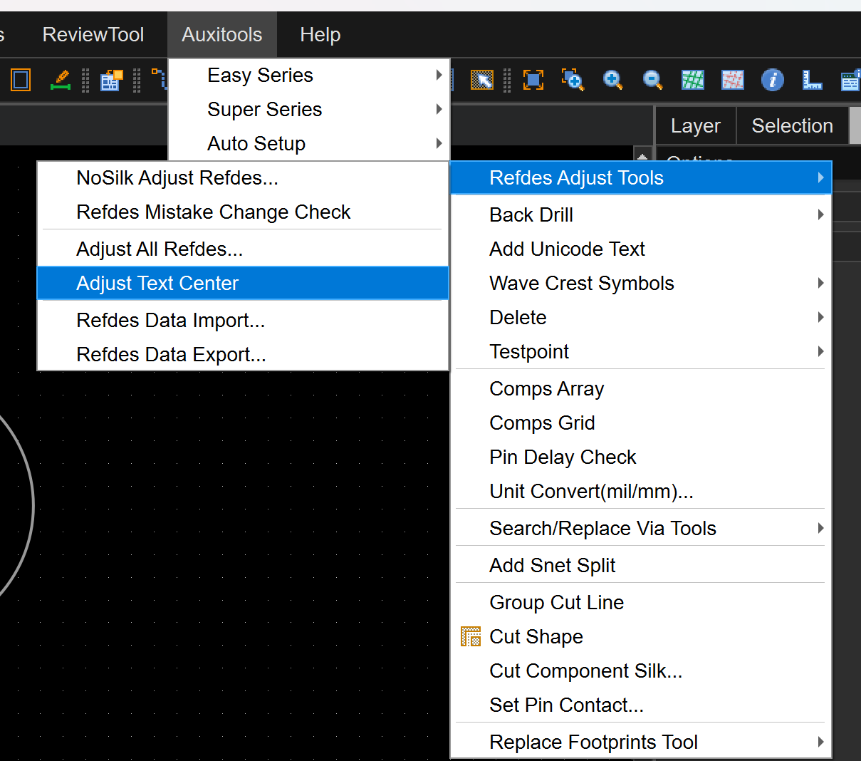 方法三:Auxitools-PCB Action-Refdes Adjust Tools-Adjust Text center