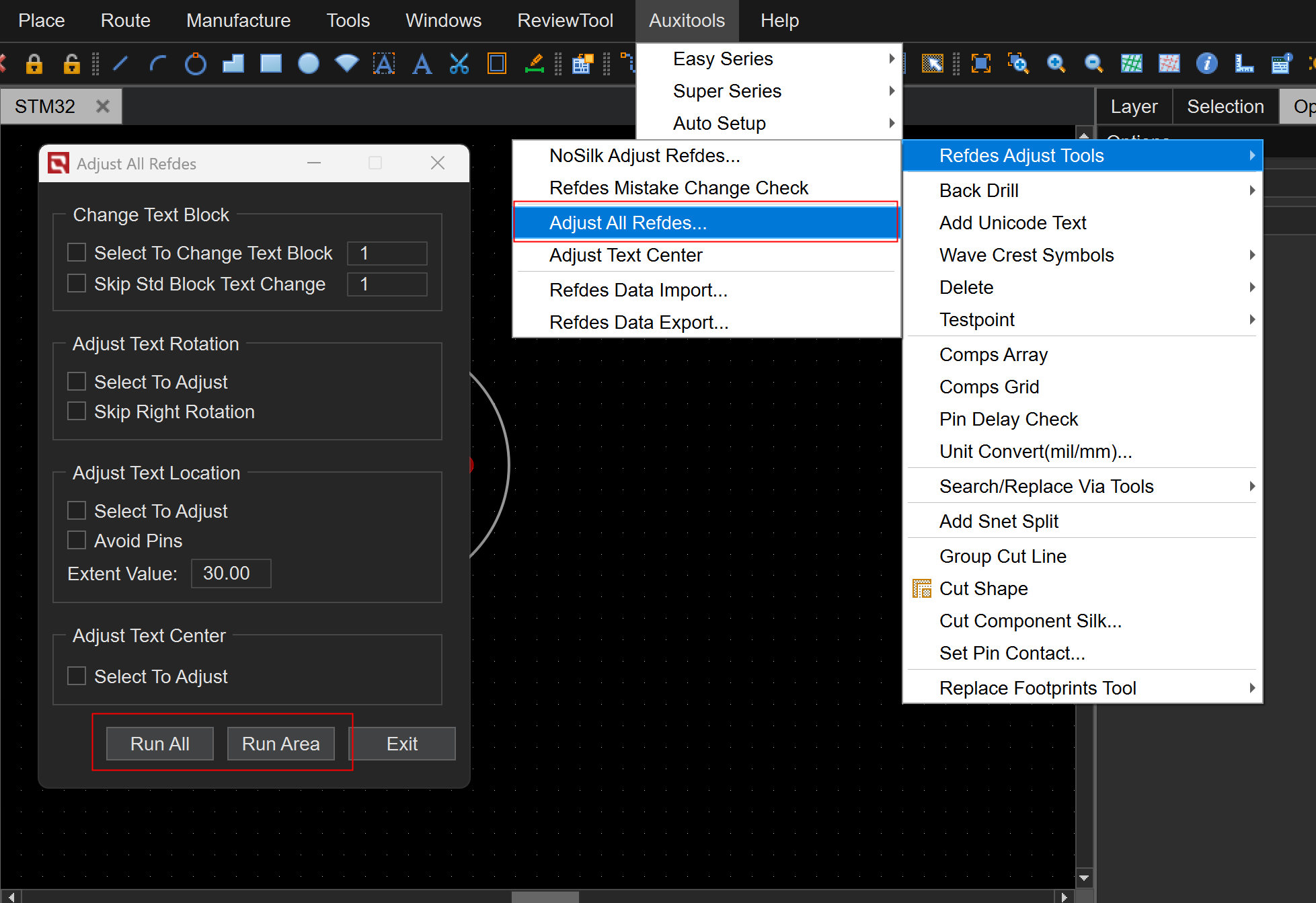 方法二:Auxitools-PCB Action-Refdes Adjust Tools-Adjust All Refdes...