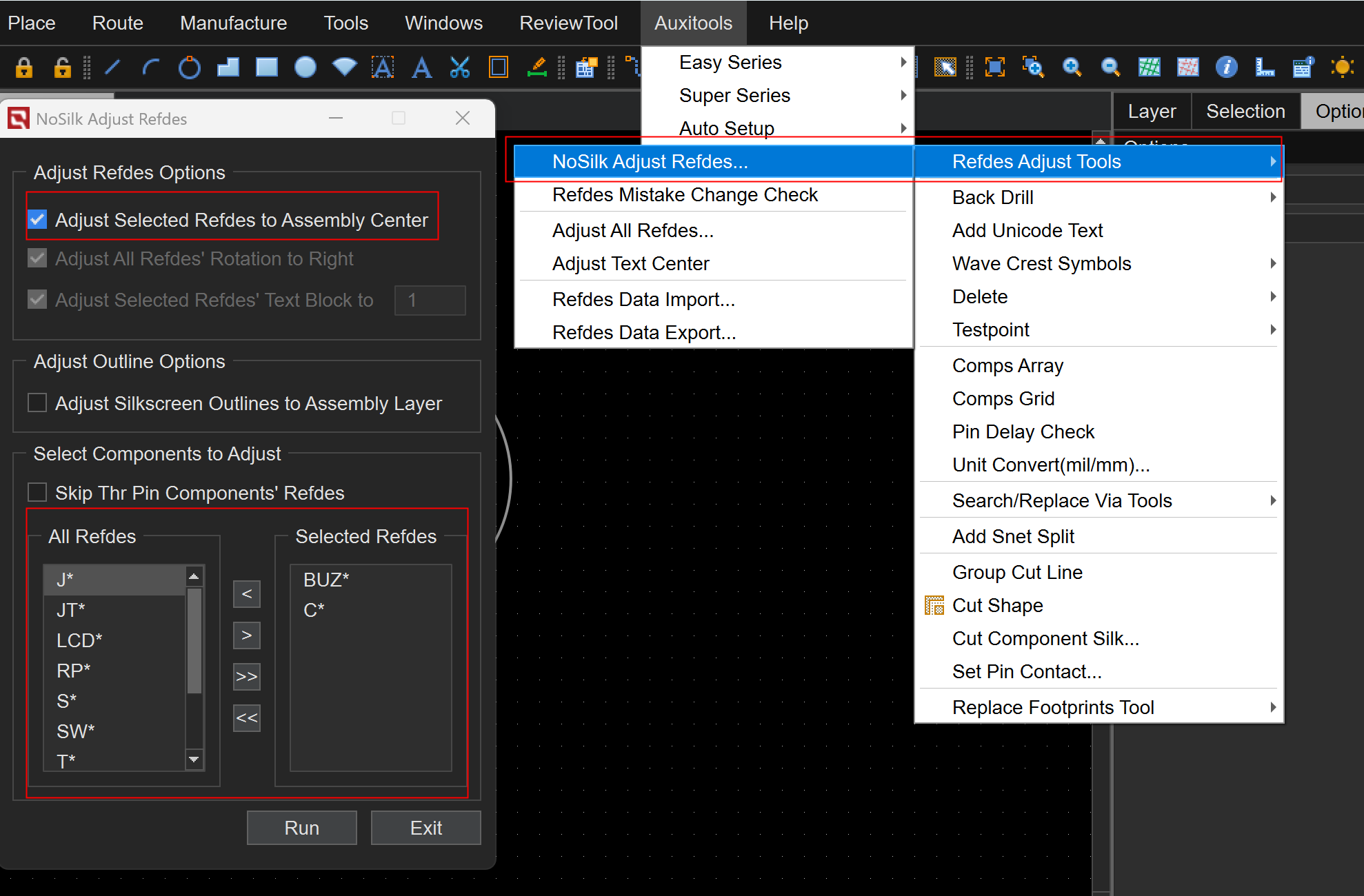 勾选Adjust Selected Refdes to Assembly Center,选择需要调整的位号,点击Run