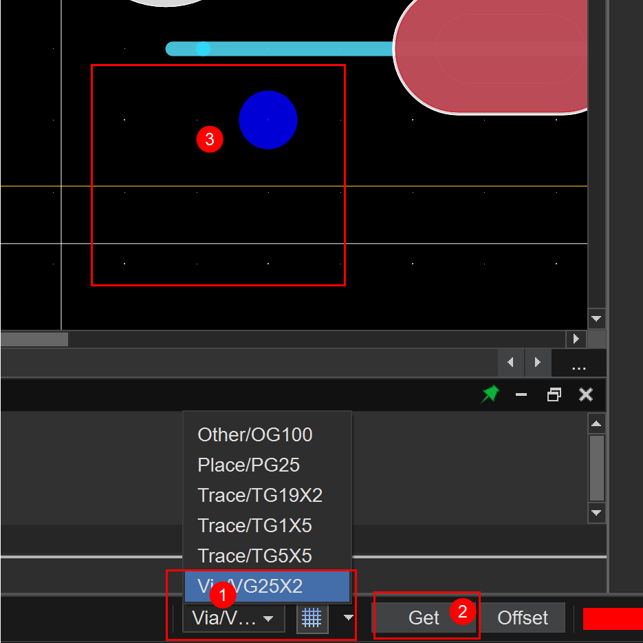 在单板下方找到格点设置,点击get后,再点击想要对齐个点的via,将孔和格点对齐。