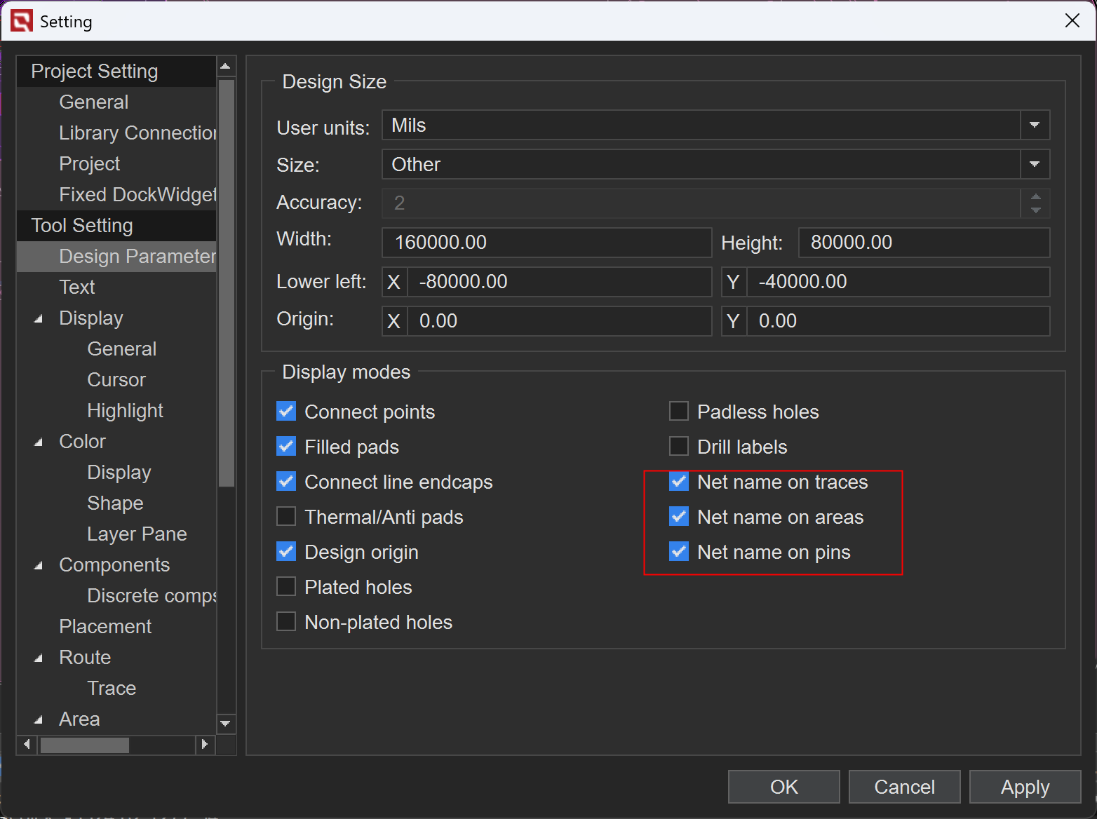 【板级EDA】【一般】【Display】如何将网络名称显示在Pin、Trace、Area上? 日期: 2026-03-12 分类: 解决方案类 问题描述 告警信息 处理过程 根因 解决方案 建议与总结 │问题描述 如何将网络名称显示在Pin、Trace、Area上? │解决方案 勾选如下配置: