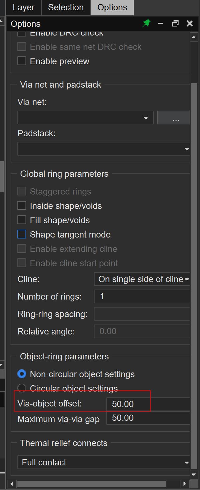 可以由Via-object offset里的正负值来指定在线的哪边打孔