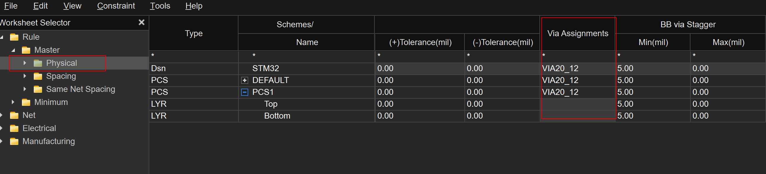 1、打开规则管理器,物理规则Physical-->Via Assignments