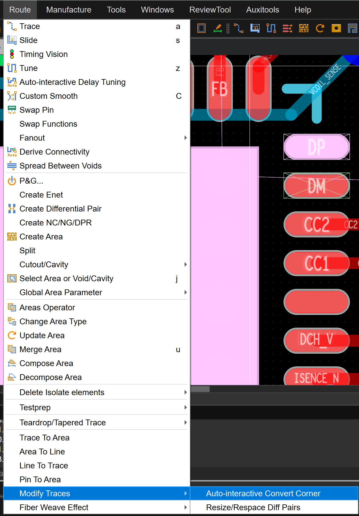 Route-Modify-Trace-Auto-interactive-Conver Corner,再点击要倒圆弧的线即可。