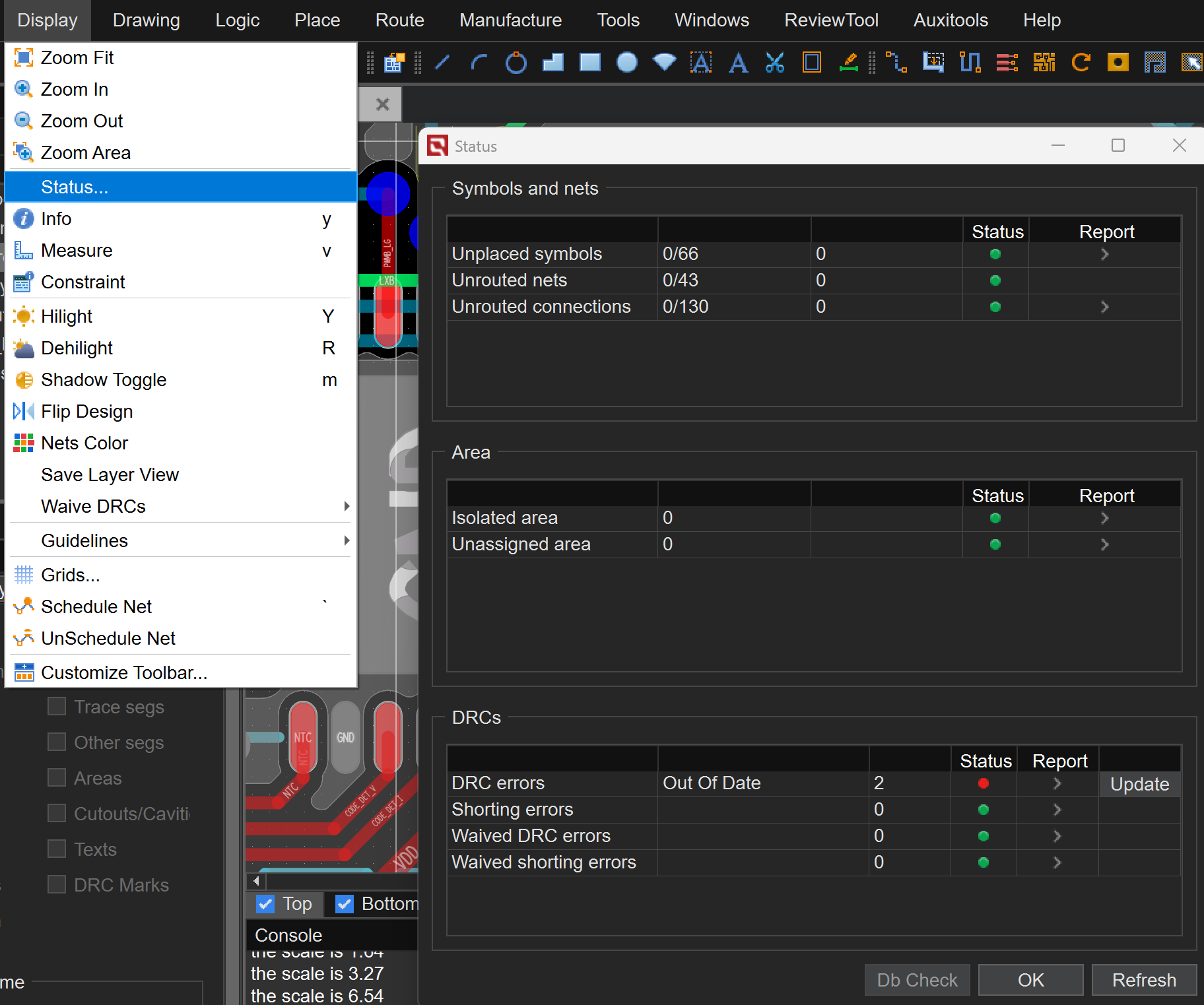 【电子工程EDA】【PCB设计】如何查看单板未连接网络,短路DRC,未布局器件等信息? 日期: 2026-03-23 分类: 解决方案类 问题描述 告警信息 处理过程 根因 解决方案 建议与总结 │问题描述 如何查看单板未连接网络,短路DRC,未布局器件等信息? │解决方案 路径:Display-status