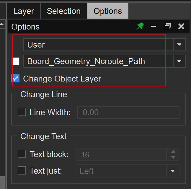2、对于已放置的DXF文件,点击Edit-->Change,Options页面-->选择User层-->再选择具体的层-->勾选Change Object Layer,然后在画布框选需要更改的层。