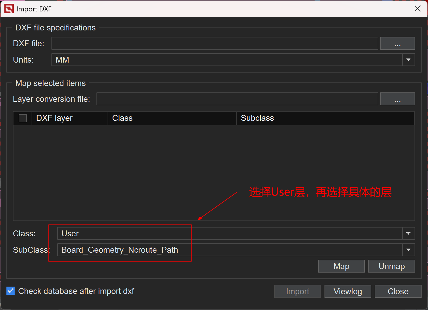 1、对于还未放置DXF文件时,点击File-->Import-->DXF,Class选择User,在SubClass选择具体的层即可。