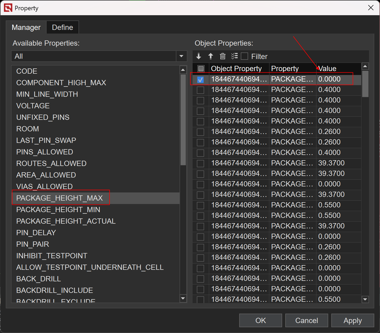 功能入口:Edit-Property-PACKAGE_HEIGHT_MAX;点击Apply,然后选择报错的Placement,更改Value为0,全部修改完后点击OK。