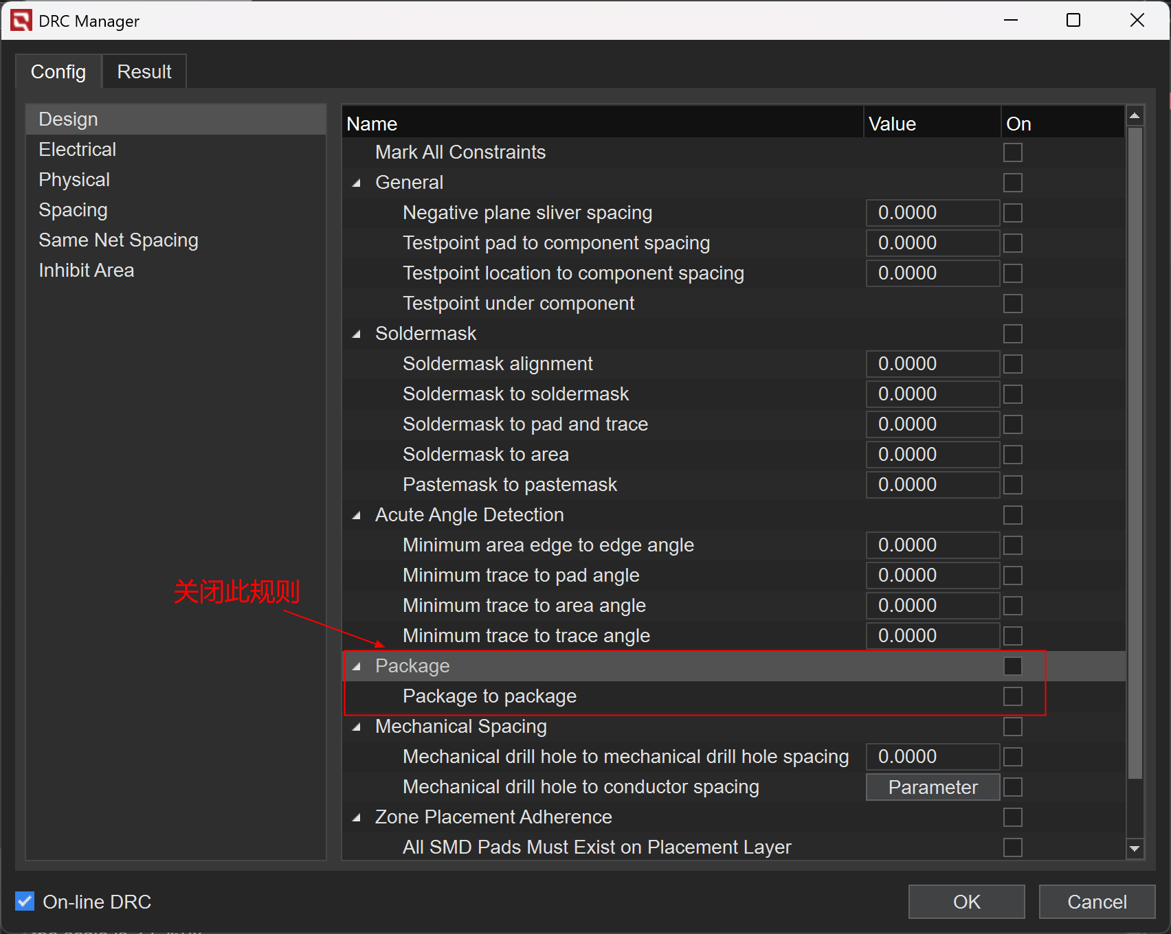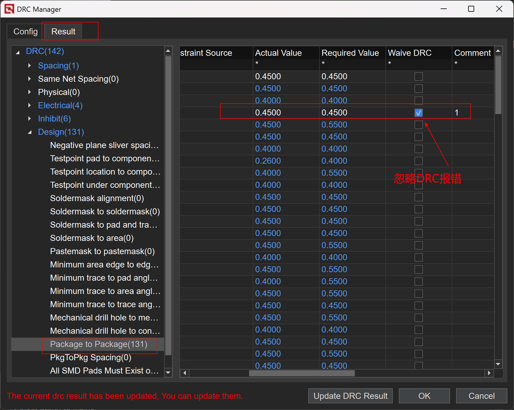 忽略DRC功能入口:Tools-->DRC Manager-->Result-->DRC-->Design-->Package to Package
