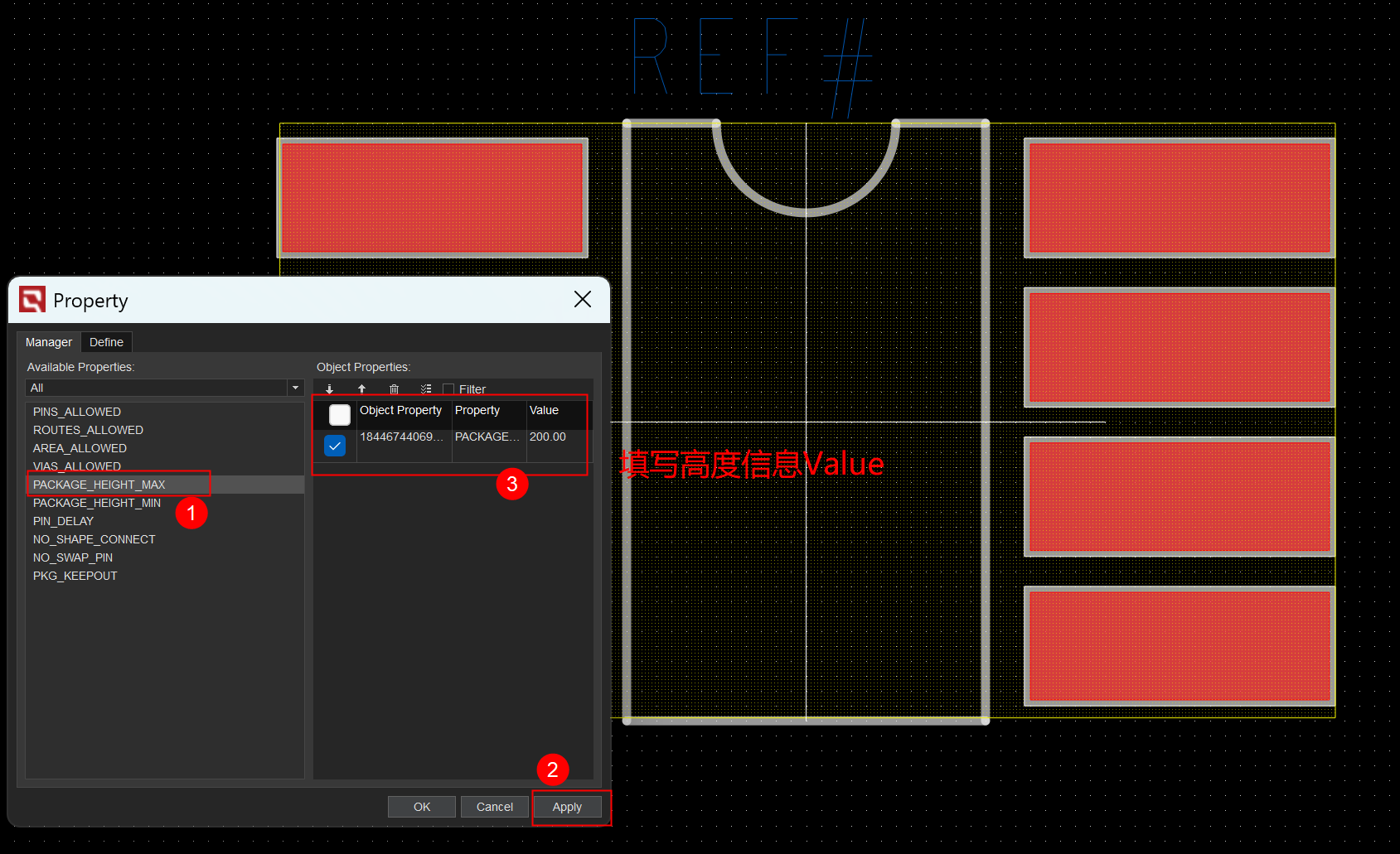 点击Edit-->Property,参考下图添加器件高度,然后保存并生成Part,点击Info可以查询器件高度。