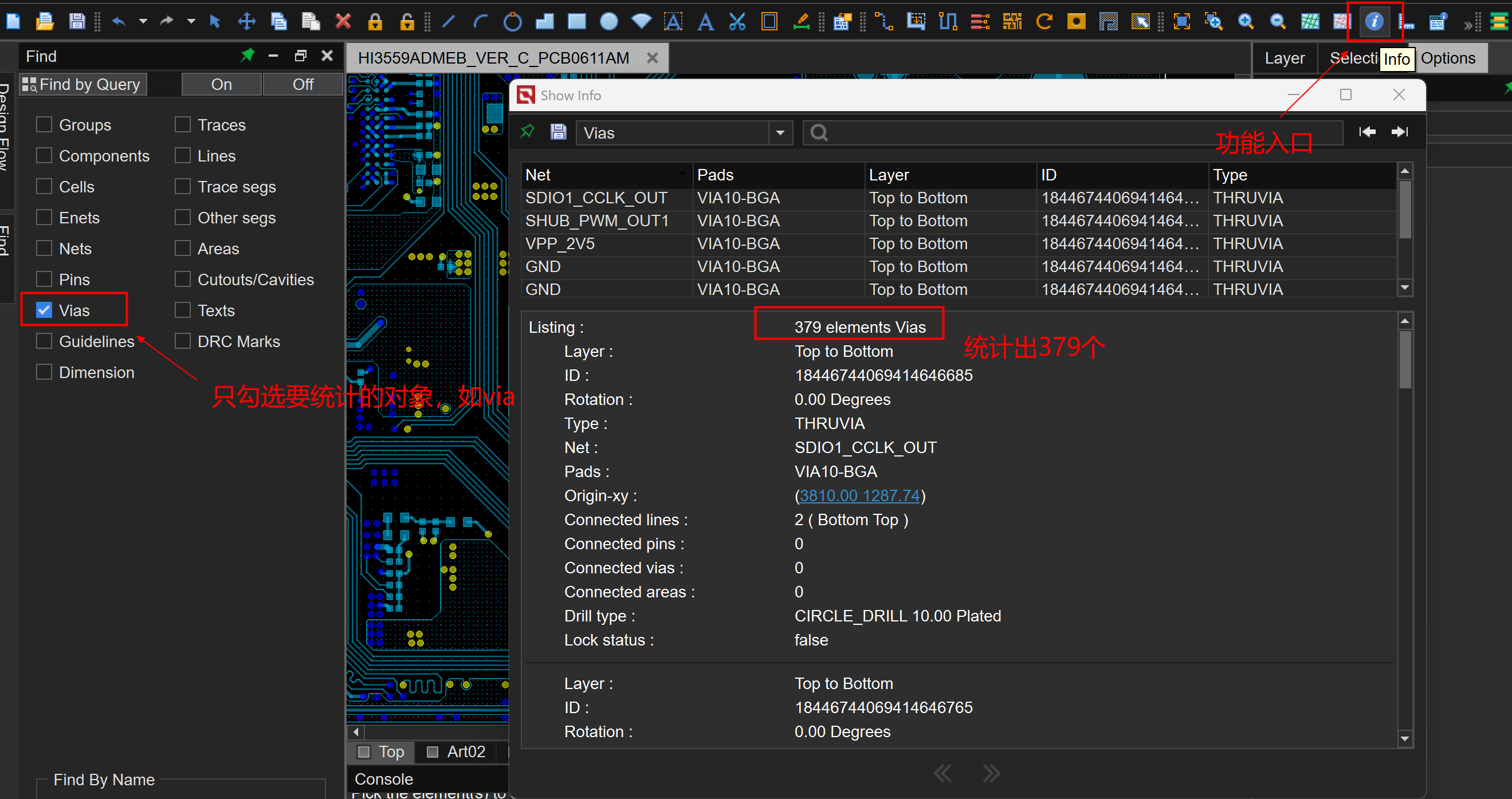 【电子工程EDA】【PCB】【统计数量】请问如何统计所选元素的数量,例如鼠标框选的一片via,统计框选的via有多少个?